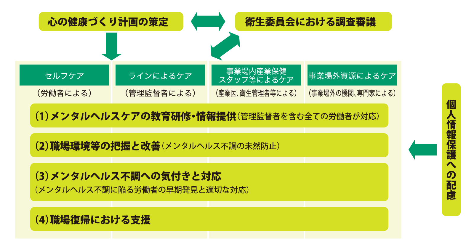 厚生労働省はメンタルヘルス対策の基本として、企業が取り組むべき「4つのケア」を、以下の図表のように示しています。これは、「従業員自身」「上司」「産業保健スタッフ」「外部の専門機関」の4つの視点から従業員の心の健康を支える仕組みです。