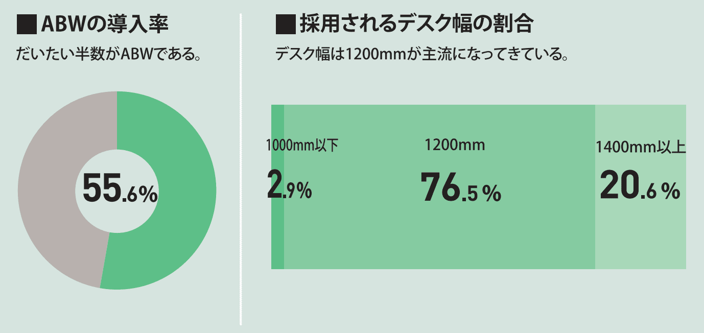 通路を除いた執務エリアのうち、デスクスペースが占める割合は59.9%だった。オフィスの過半数(55.6%)がABWを導入しており、デスク以外のスペースを含めた面積の割合も、いずれも2024年度版とほぼ同程度となっている。レポートでは、ABWが普及してきた近年の傾向が、数値として定着しつつあると分析している。また、デスク幅は約8割のオフィスで1200mmが採用されている。