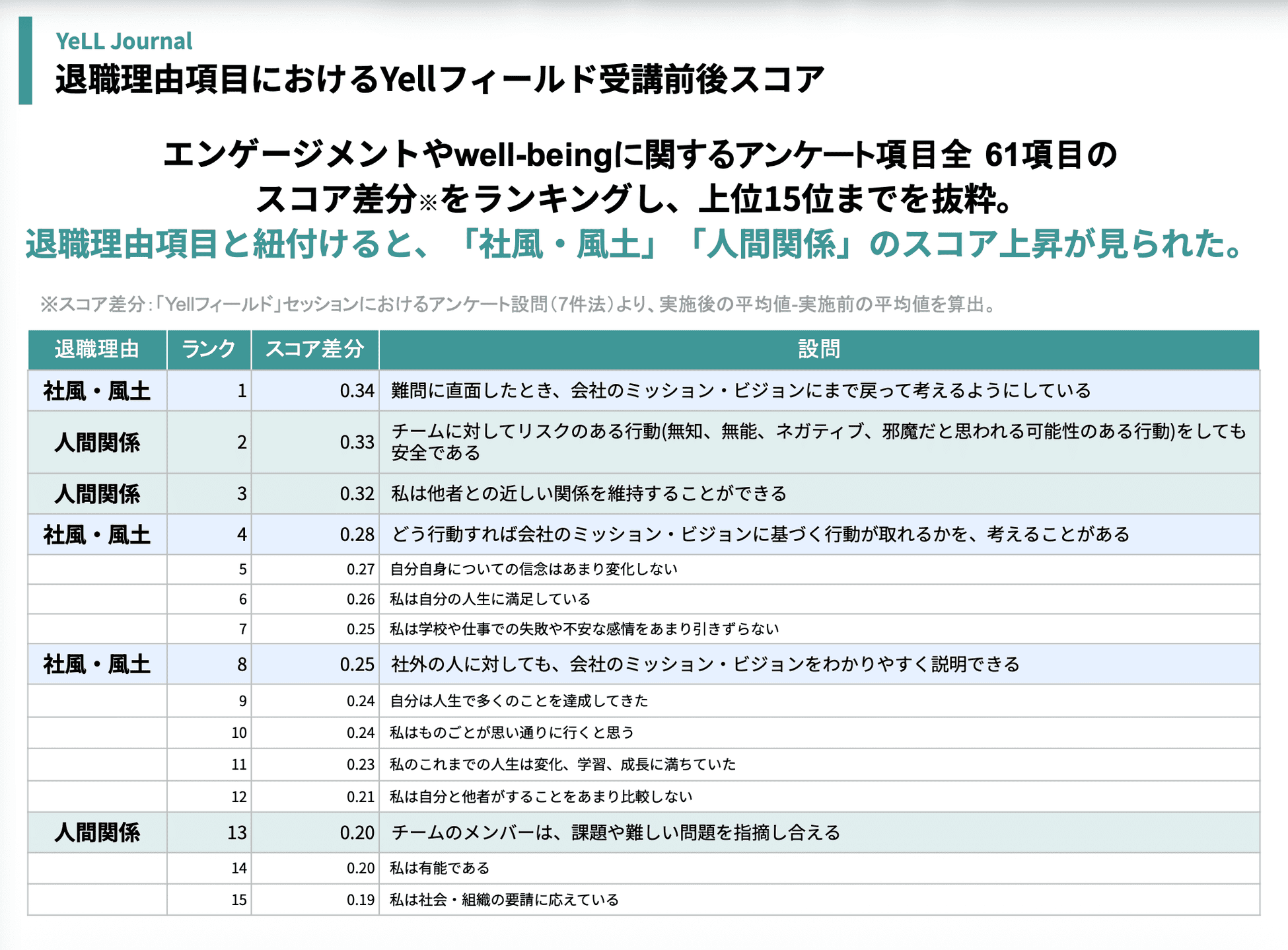 同レポートでは、同社が提供する社外1on1研修「YeLLフィールド」の受講者2306人を対象に、受講前後のアンケートデータを分析した。退職理由として頻出する「社風・風土」「人間関係」といった指標に着目し、「自己理解の深化」が退職予防に与える影響を考察している。