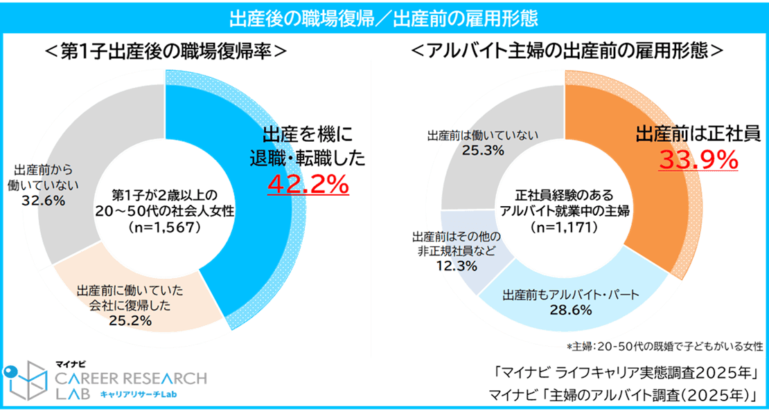第1子が2歳以上の子供を持つ20歳代~50歳代の社会人女性を対象とした調査では、第1子出産後に「出産前に働いていた会社に復帰した」のは25.2%にとどまり、「出産を機に退職・転職した」は42.2%に上った。