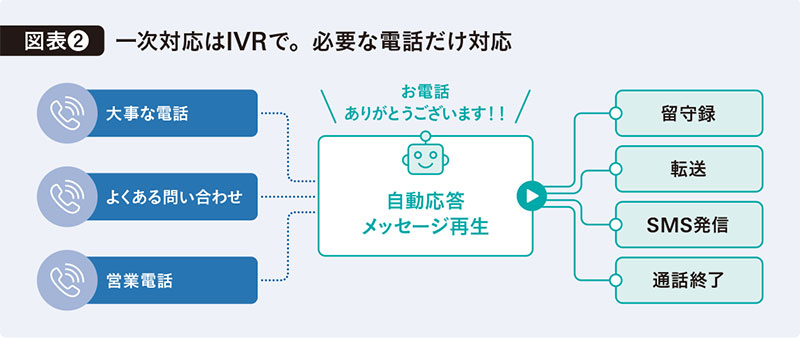 個人番号では、曜日別に着信設定が可能だ。メッセージの読み上げ、留守録、転送、切断といったアクションを組み合わせることで、たとえば平日の営業時間中は通常着信、営業時間外や休日は留守録といった使い分けができる。一方、代表電話向けにはIVR(電話自動応答システム)機能を用意した。代表電話には、「大事な電話」「よくある問い合わせ」「営業電話」など、さまざまな着信がある。こうした着信を自動で振り分けることで、わずらわしい電話対応から解放される(図表2)。