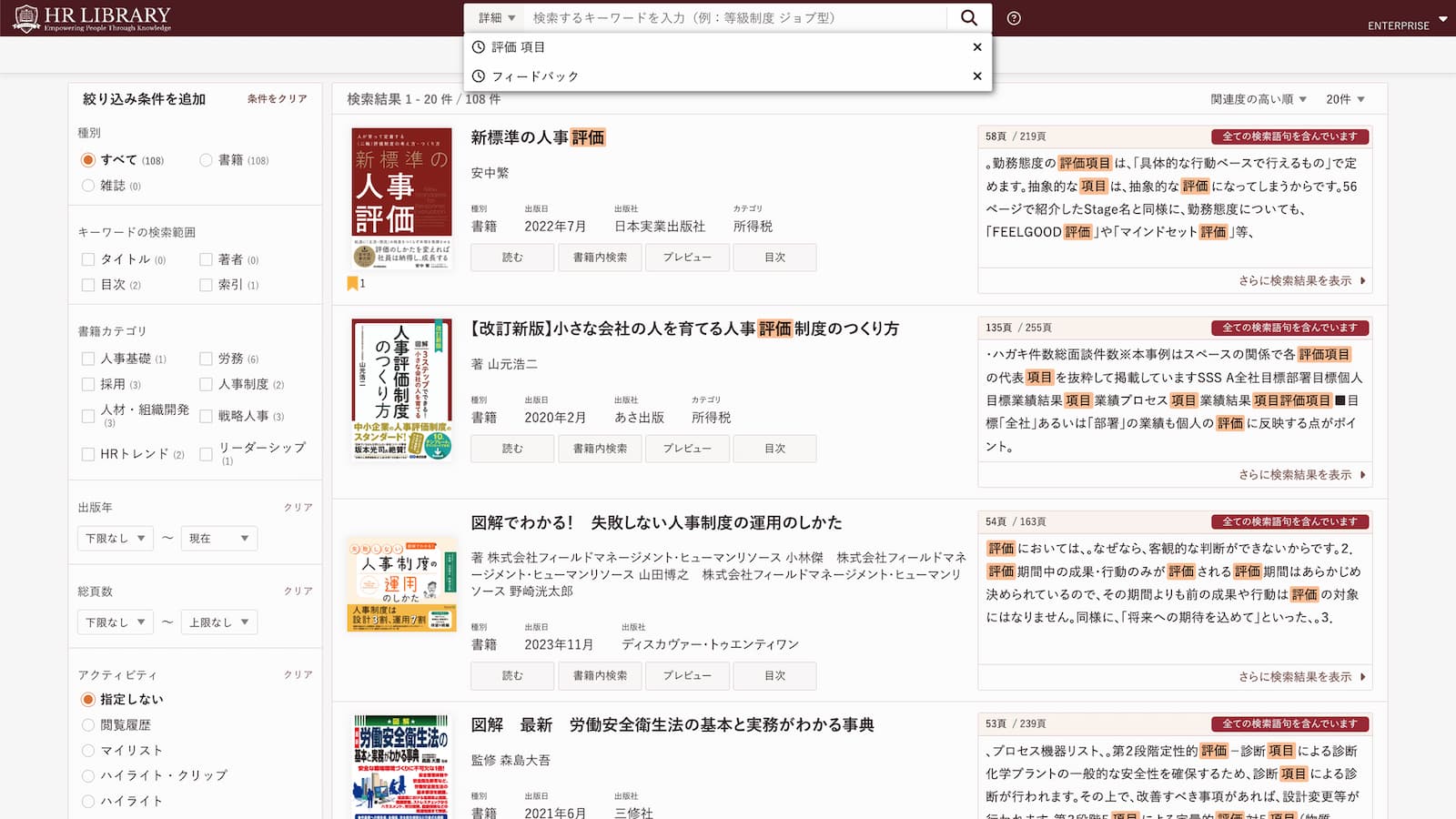 「HR LIBRARY」では、人事・労務分野の書籍をオンライン上で閲覧・検索することができる。