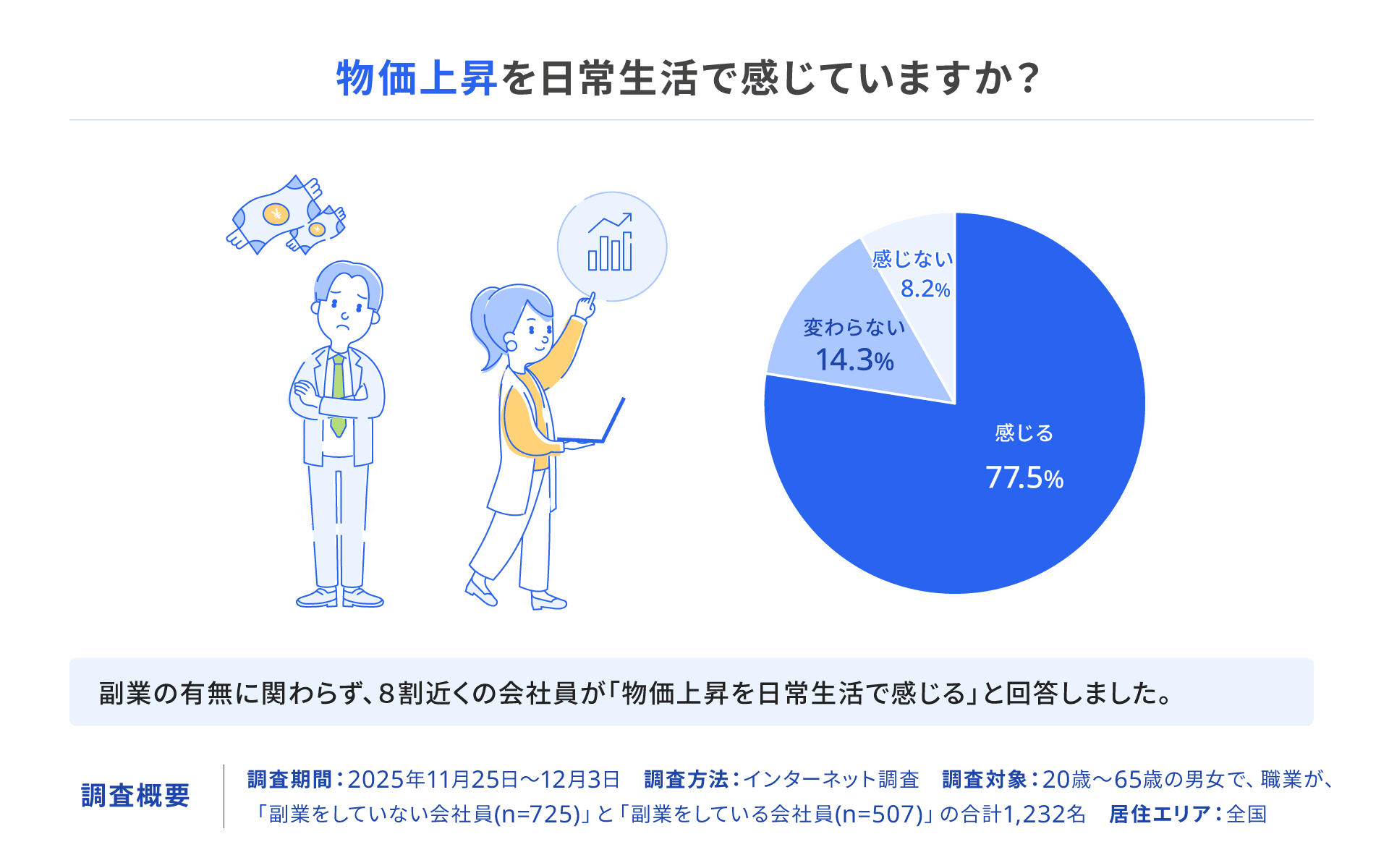 調査では、約8割の会社員が日常生活における物価上昇を実感し、今後の生活やキャリアに不安を抱いている実態が明らかになった。また、物価上昇への対策として、副業を検討・実施している層が一定数存在し、その内容にも変化が見られる結果となった。