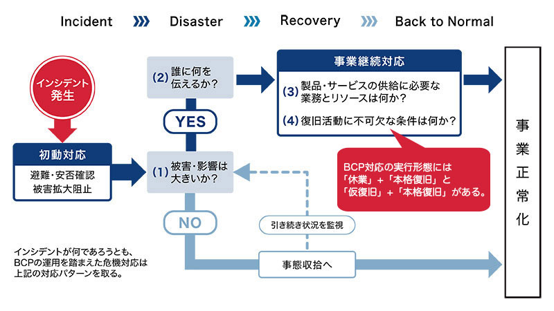 深刻なインシデントが発生し、業務に不可欠なリソース(人材や設備その他)が被害を受けると、通常のやり方では業務が行えないので、あらかじめ「別の方法」を考えておかなくてはなりません。このとき、まさに「別の方法」で業務対応を行う、あるいは復旧を急ぐための呼び掛けが「BCPの発動」です。では、BCPを発動する経営者の脳裏には、どのような「別の方法」が用意されているのでしょうか。