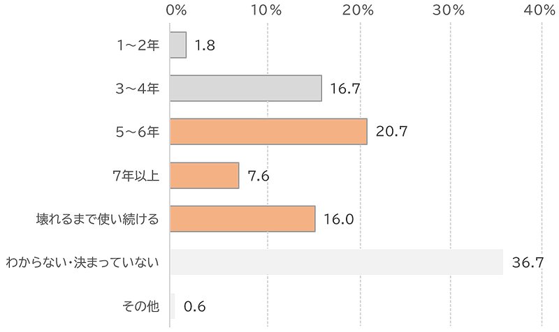 また、理想的な買い替えサイクルについて尋ねたところ、「3〜4年」(23.6%)という回答が多かった。使用開始から3、4年経つと何らかの「買い替えたい理由」が出てくる、と同社は分析する。