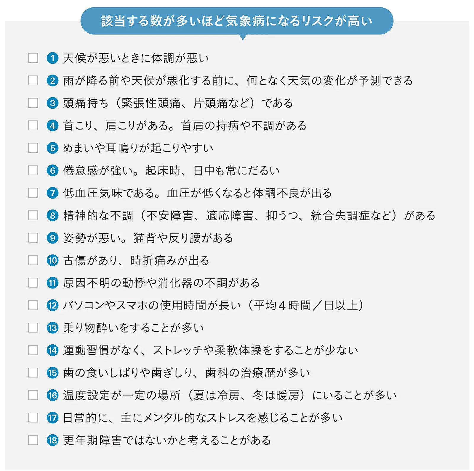 さて、病院では不調の原因がわからなくても、患者本人は天候との関係を経験的に感じていることが多いです。私は5000人を超える診察例から気象病のチェックリストを作りましたが(図表)、ここまで詳細に聞かなくても、だいたい最初の2問で判断できます。「天候が悪いときに体調が悪い」「雨が降る前や天候が悪化する前に、何となく天気の変化が予測できる」、どちらかに当てはまったら私の中では8割方、気象病だと診断できるのです。