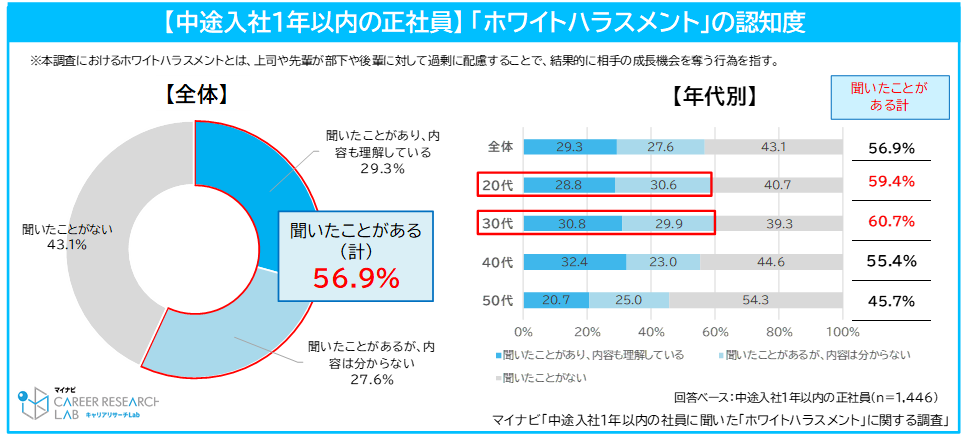 マイナビ(東京都千代田区)は4月9日、中途入社1年以内の20歳代から50歳代の正社員1446人を対象に調査した「ホワイトハラスメントに関する調査」の結果を公開した。