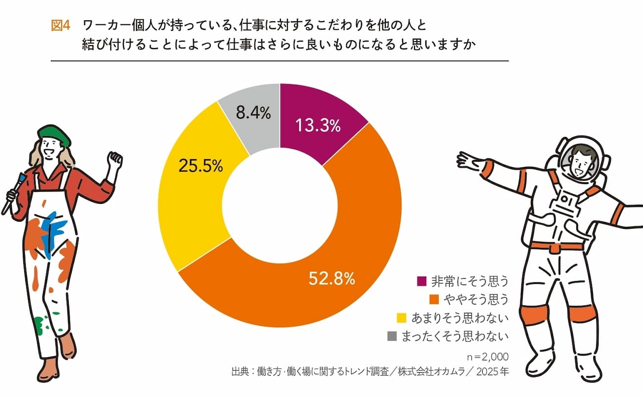 さらに、個人の偏愛が集まるだけでは十分な成果を得られない。それぞれのこだわりや情熱をいかに結びつけ、相乗効果を生み出していくかが今後の企業にとって重要になる。同社の調査では、「自分の仕事に対するこだわりを他者と共有することで、よりよい仕事につながると思う」と回答した人が7割近くにのぼった。