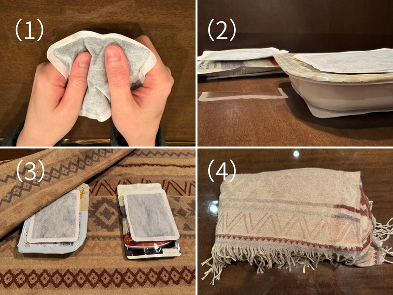 (2)パックご飯とレトルトカレーをそれぞれ、カイロで写真のようにはさむ