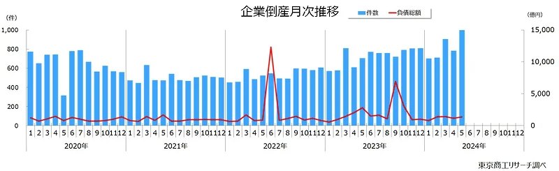 東京商工リサーチ(東京都千代田区)は6月10日、2024年5月の全国企業倒産(負債額1000万円以上)を公表、2013年7月(1025件)以来、倒産件数が10年10か月ぶりに1000件を超えたと発表した。