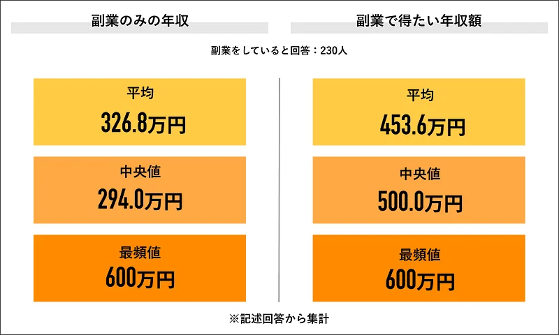 副業経験がある230人の副業のみの平均年収額は326.8万円、中央値でも294.0万円だった。副業で得たい理想の年収額の平均は453.6万円で、理想と実際では126.8万円の差が生じている。