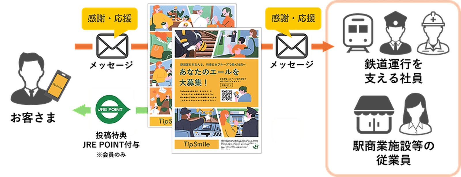 「TipSmile」は、駅や店舗に設置されたポスターやSNSなどを通じて、顧客が従業員に感謝や応援の気持ちを投稿できる社内コミュニケーションサービスである。ポスターなどに記載された二次元コードやURLにアクセスすることで、スマートフォンから簡単にメッセージを送信できる。投稿者は、JRE POINT会員として連携登録を行うことで、ポイント付与などのインセンティブも受け取ることができる。