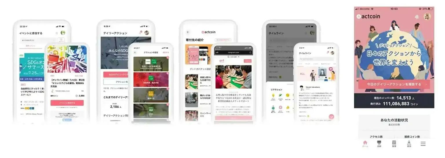 actcoinは、ユーザーがオンライン・オフラインで社会貢献活動に参加するたびにデジタルポイント(コイン)が付与されるアプリケーションサービス。ボランティアへの参加や寄付などの実践報告がコイン付与の対象となる。