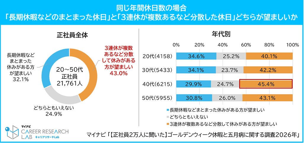 調査では、全体の4割以上が、同じ年間休日数であれば「3連休が複数あるなど、分散して休みがある」(43.0%)方が望ましいと回答。「長期休暇などまとまった休みがある」(32.1%)を約10ポイント上回ったことがわかった。特に40歳代で「分散した休日が複数ある」が高い傾向が見られる(45.4%)。