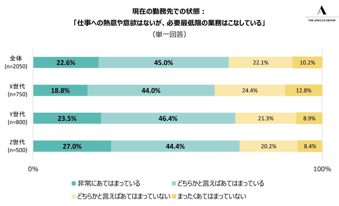 世代別に見ると、Z世代が71.4%と最も高く、Y世代(29歳~44歳)では69.9%、X世代(45歳~59歳)でも62.8%が、「静かな退職」が自身に当てはまると感じている。