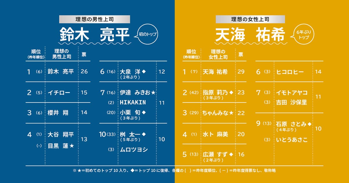 2026年度の結果では、理想の男性上司の1位に俳優の鈴木亮平さん、理想の女性上司の1位に俳優の天海祐希さんが選ばれた。併せて、理想の上司像としては「安心して意見や質問ができる雰囲気をつくってくれる」「ミスをしたときにフォローしてくれる」「常に部下を気にかけてくれる」といった項目が上位に挙がった。